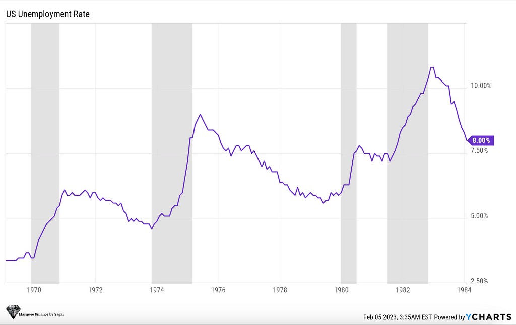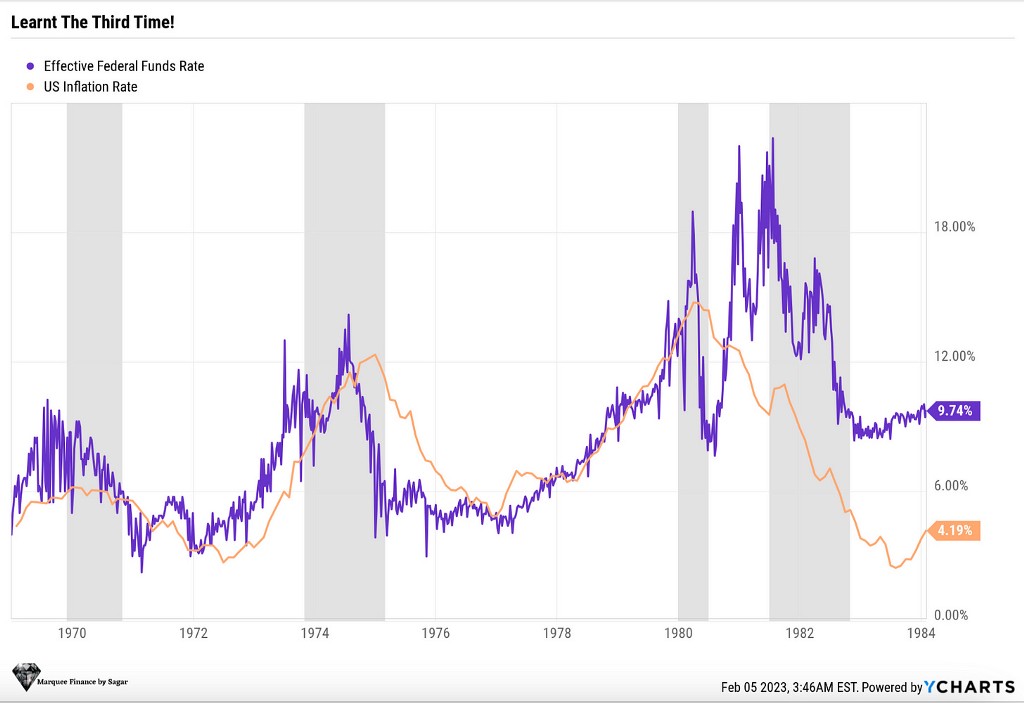 Irrespective of the recession of 1982, the Fed, under the leadership of Volcker, kept the rates high until inflation fell off to 6% from double digits (even though the unemployment rate spiked to more than 10%)