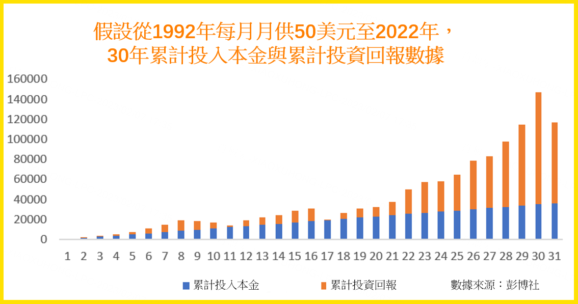 老虎證券綜合賬戶支持每週/每兩週/每月月供。根據計算統計:假設從1992年開始每月月供50美元標普500,到2022年的時候,30年投資總額為36000美元,而投資利潤達到81192美元,年化回報率達到7.52%。