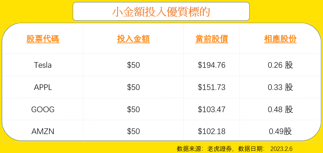 有了這個功能,無論看中的股票是每股 1000 美元或是 500 美元,你都可用你希望投入的資金買入。例如下表:可以用 $200 買入4隻股票:$特斯拉(TSLA)$ 投入50美元,蘋果$蘋果(AAPL)$ 投入50美元,Google$谷歌(GOOG)$ 投入50美元,Amazon$亞馬遜(AMZN)$ 投入50美元等。
