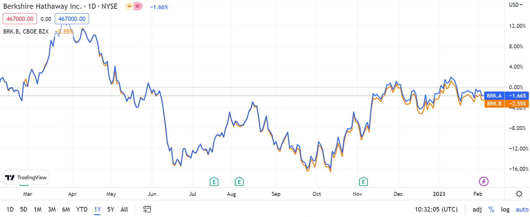 如果你想投資巴郡又囊中羞澀,巴郡B$伯克希爾B(BRK.B)$ 是一個可以考慮的替代選擇,而且兩隻股票的趨勢幾乎相同: