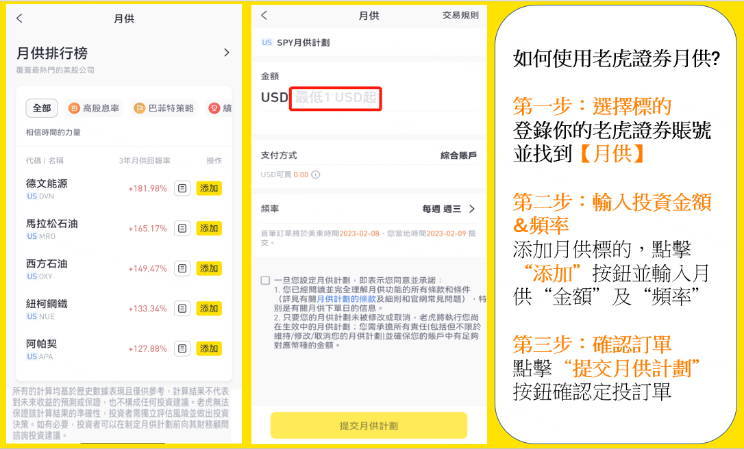 Tiger Trade的月供功能適用於標準普爾500成分股、美股ETF和熱門中概股,最低月供金額1 美元起。