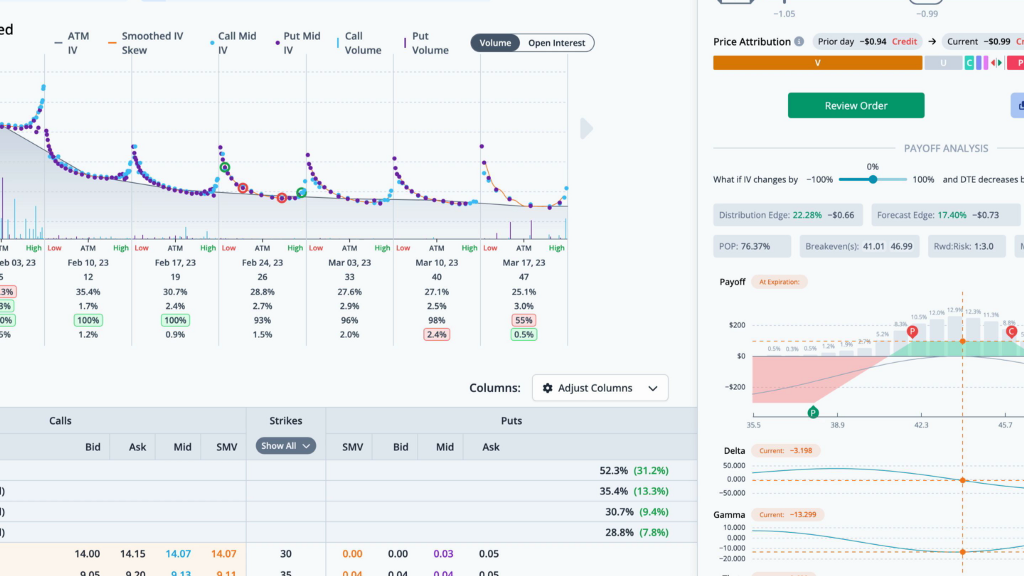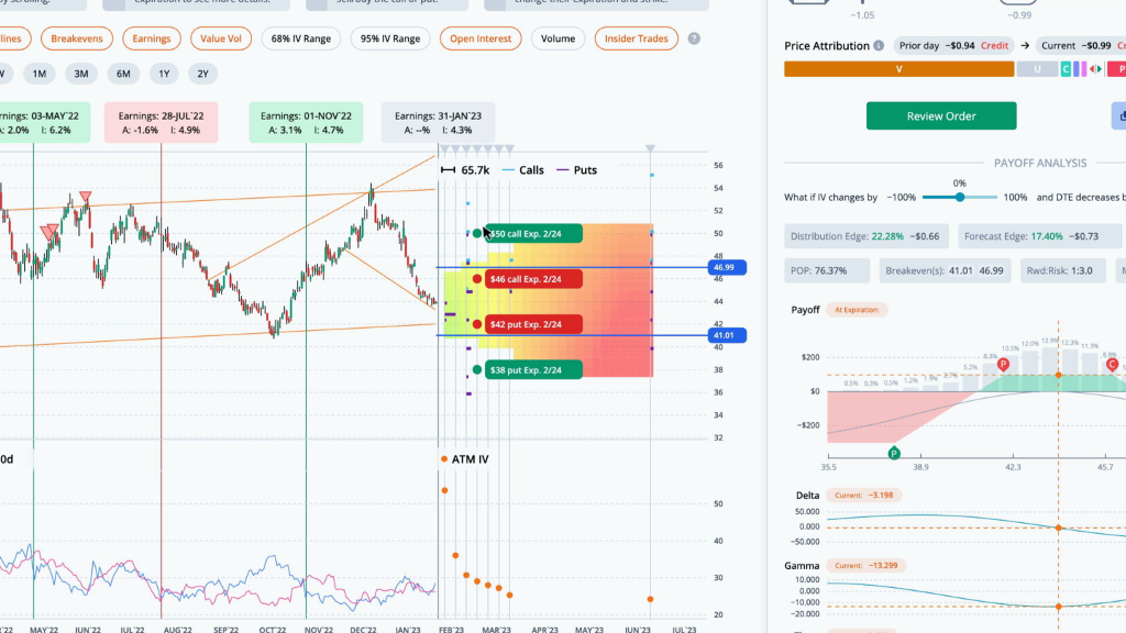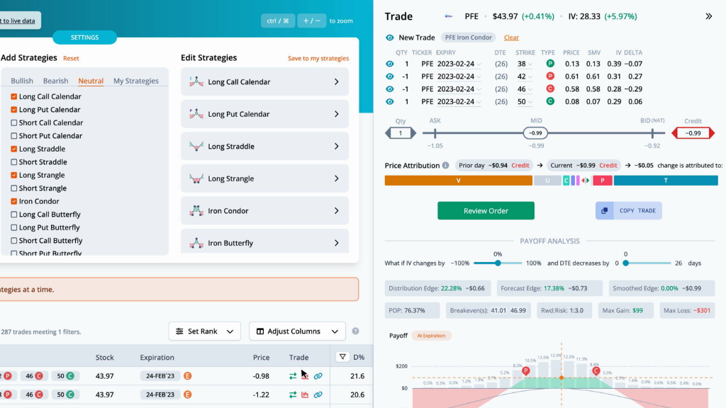 By pulling up the trade, we can see the theoretical values in more detail. The distribution edge, found by the expected value of the payoff picture on the stock’s historical distribution, has an edge of 22.3%. The forecast edge, which is derived from historical volatility, has an edge of 17.4%. Lastly, the smoothed edge, which is calculated by drawing a best fit curve through the monthly implied volatilities, has an edge of 0.0%. The edge is relative to the mid-market price of the trade. Greater positive edges are a theoretical benefit to the trader. We can also look at the payoff graph. The probability of profit sums the probability of the nodes for the part of the payoff picture above the zero profit line over three standard deviations. For this trade the probability of profit is 76.37%. The reward to risk divides the max gain by the max loss. Here the 1 to 3.0 is the ratio of the max gain of $99 to the max loss of $-301. There are two break evens for this IronCondor at 41.01 and 46.99. You can also view the price attribution to see how much each of the individual greeks and theoretical values contribute to the change in trade price from yesterday to today.