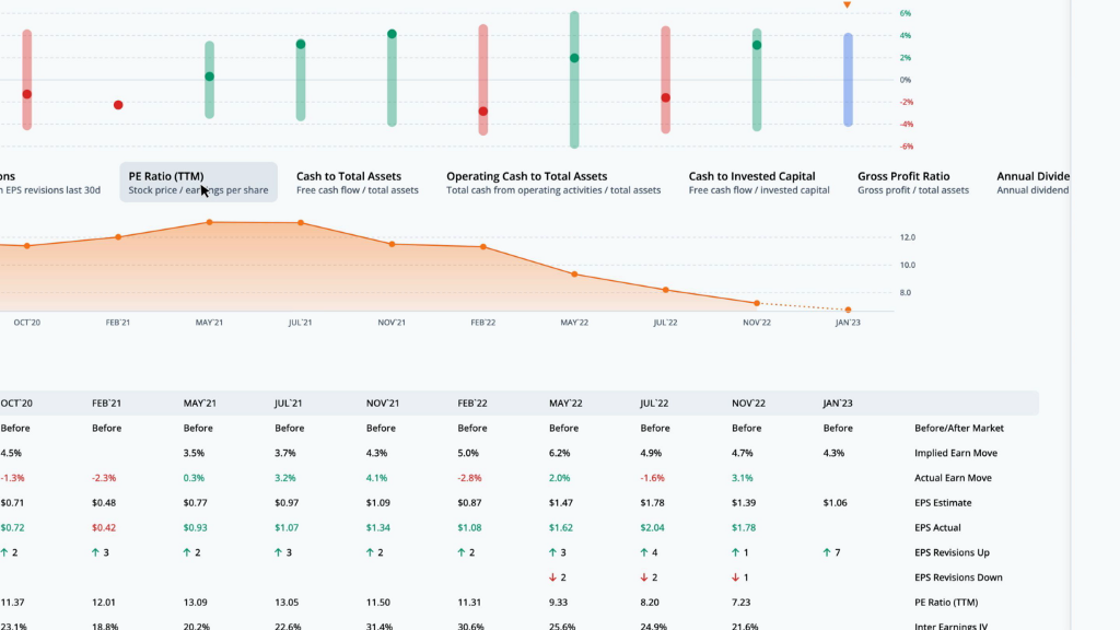 During that time, the post-earnings move was outside of the implied range 1 times. In those cases, long straddles were profitable. The rest of the earnings moves likely yielded profitable short straddles. We can overlay quarterly financial data by clicking on the ratios below the earn move graph. Let’s look at the PE ratio, which is the stock price divided by the trailing twelve months earnings per share.