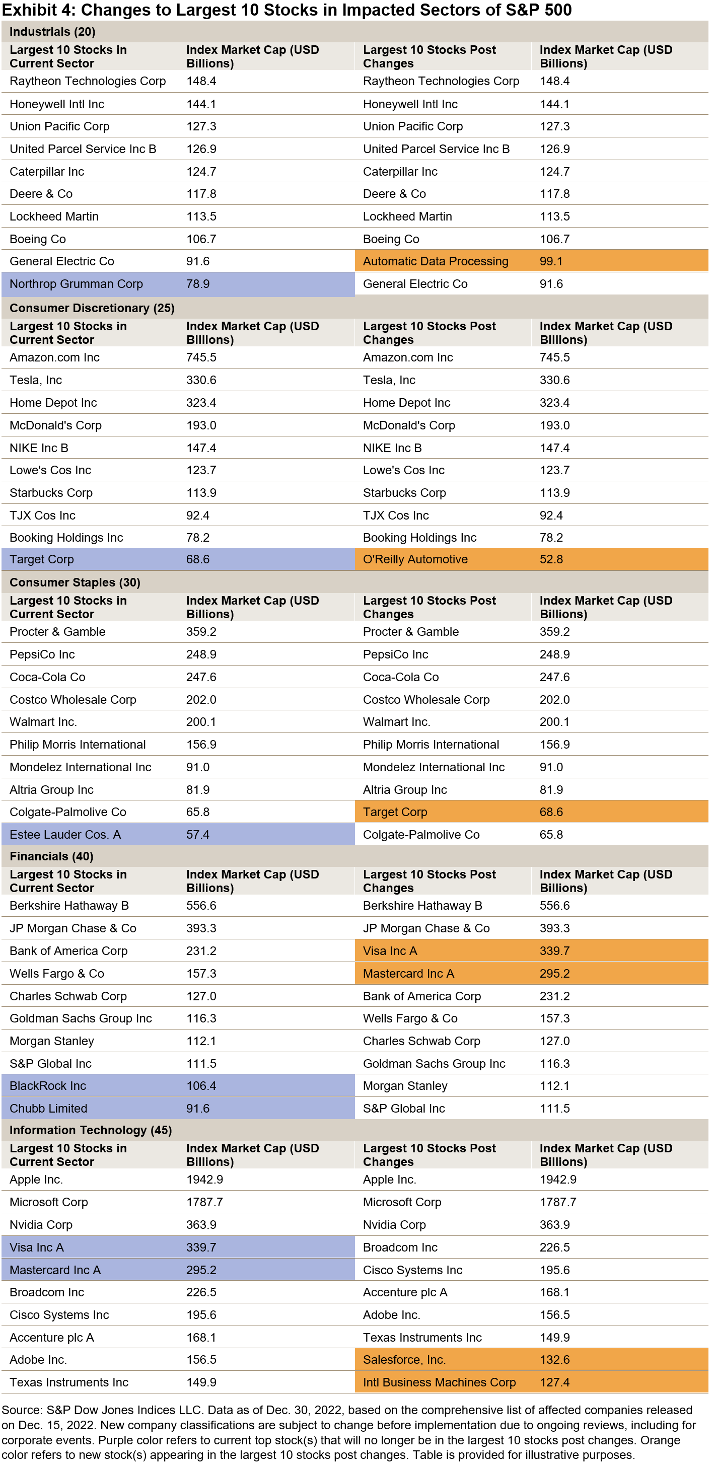 Exhibit 4 shows how the upcoming GICS changes are set to affect the largest 10 stocks in the impacted sectors, based on the data as of Dec. 30, 2022. Target Corp will move from Consumer Discretionary to Consumer Staples, displacing $Estee Lauder(EL)$ from the largest 10 corporations in the Consumer Staples sector, while Visa and Mastercard will move from Information Technology to Financials.