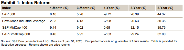 - The $S&P 500(.SPX)$ was up 6.18% in January, bringing its one-year return to -9.72%.