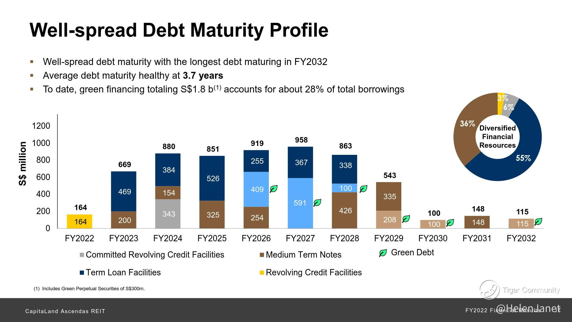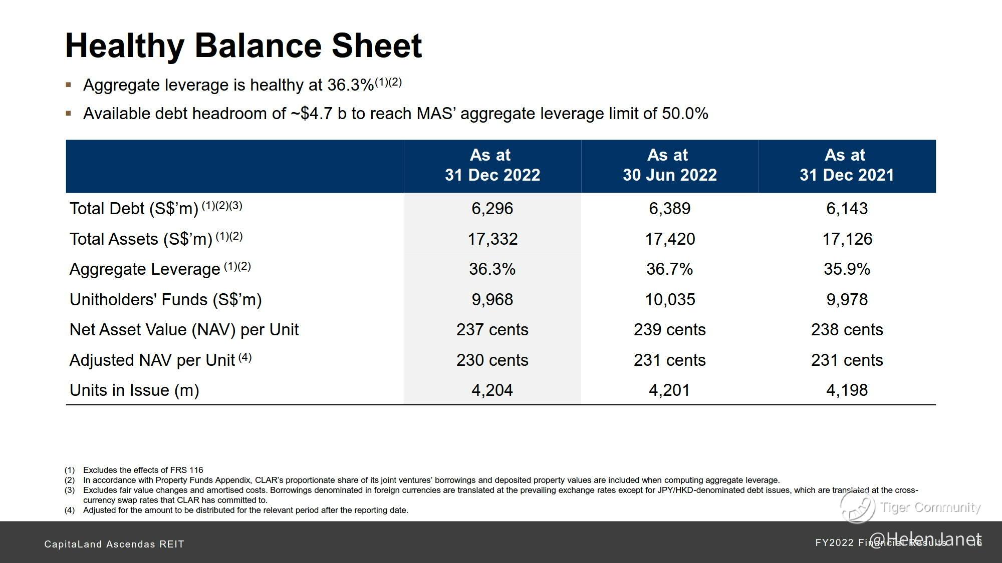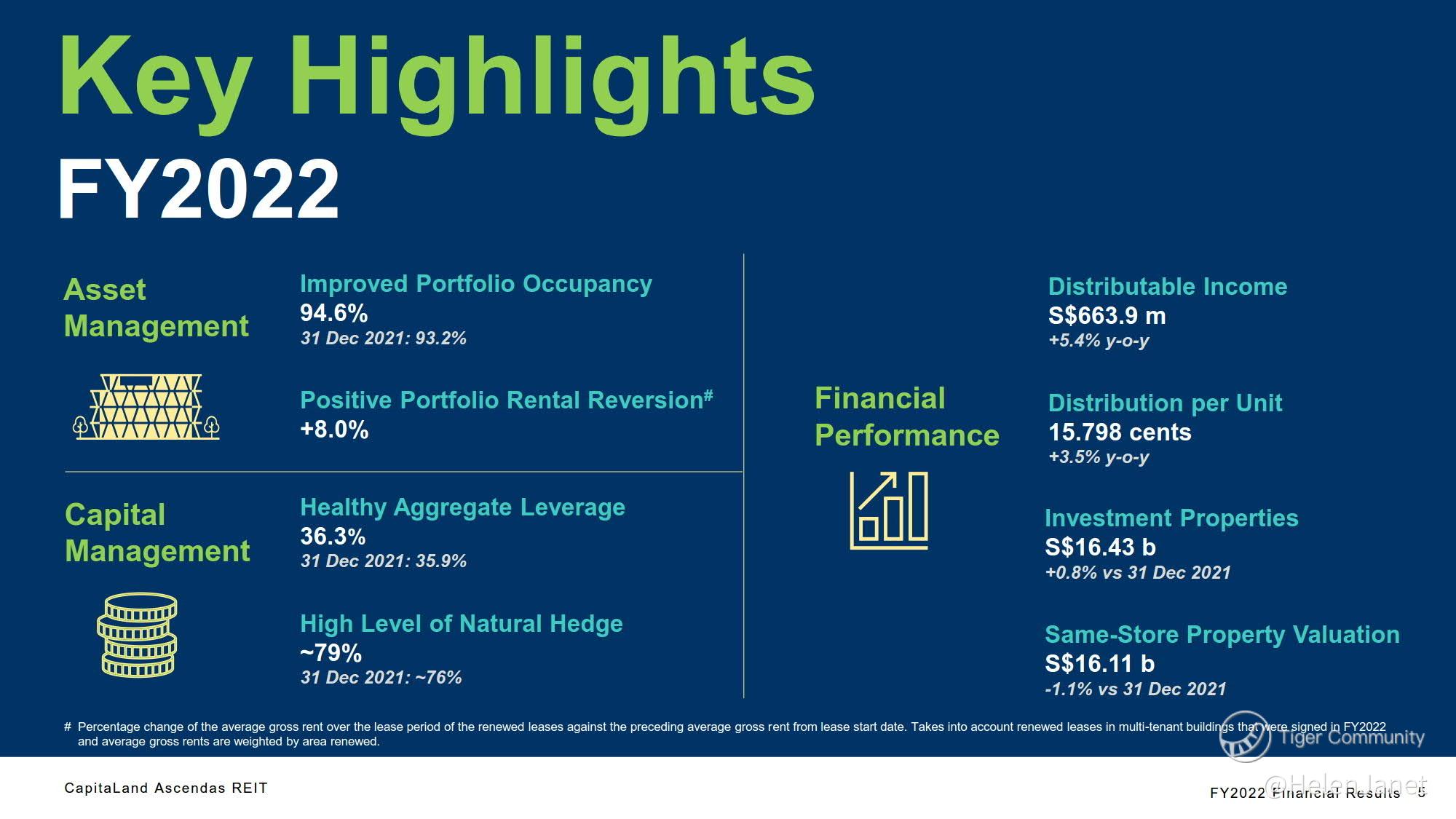Net property income (NPI) rose by 5.2% y-o-y to S$968.8 million despite cost pressures. The total amount available for distribution rose 5.4% y-o-y to S$663.9 million. DPU rose 3.5% to 15.798 Singapore cents for FY2022 due to the increase in NPI and the absence of the Manager’s performance fee, which was partially offset by an increase in borrowing costs.