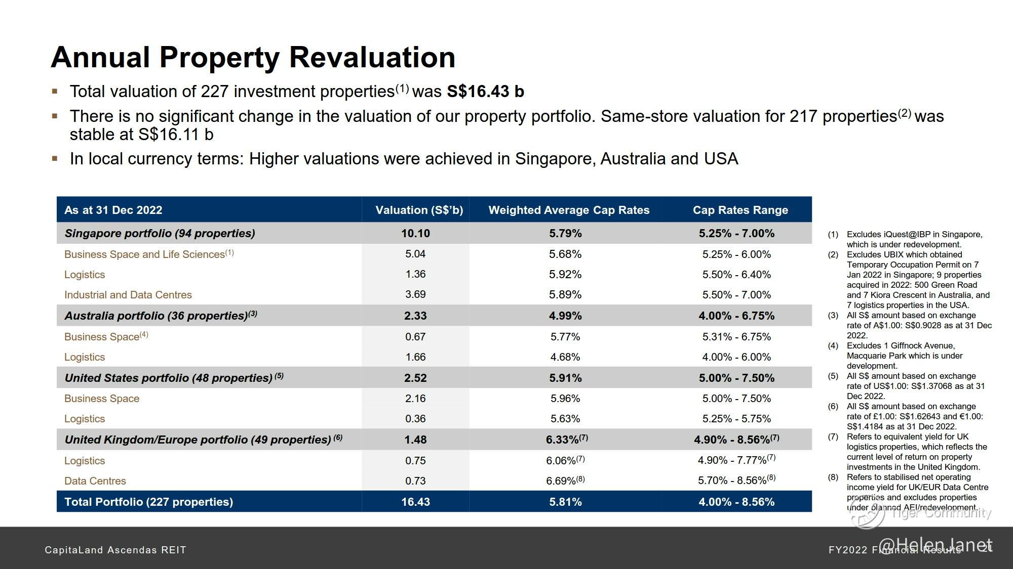 As of 31 December 2022, CLAR owned 227 investment properties worth S$16.4 billion. This comprised S$10.1 billion (61.5%) of properties in Singapore, S$2.5 billion (15.3%) in the US, S$2.3 billion (14.2%) in Australia and S$1.5 billion (9.0%) in the UK/Europe.