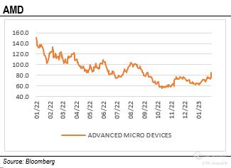 $Advanced Micro Devices(AMD)$ 4Q22 results were in-line with expectation with its Data Center offsetting the weaker PC and Gaming demand. Cloud service providers in North America continue to help drive up solid growth in the Data Center segment with a 42% y-o-y growth. However, the Client segment revenue fell by 51% y-o-y due to high inventory of the PC market. AMD expects 1Q23 sales to be down 10% y-o-y on continue pressures from Client and Gaming Segment. AMD trades at 26.5x/19.8x of FY23/23 consensus price to earnings ratio. The strategic acquisition of Xilinx could help diversify its overall business and AMD expect to continue to gain market share despite the challenging macro-economic environment.