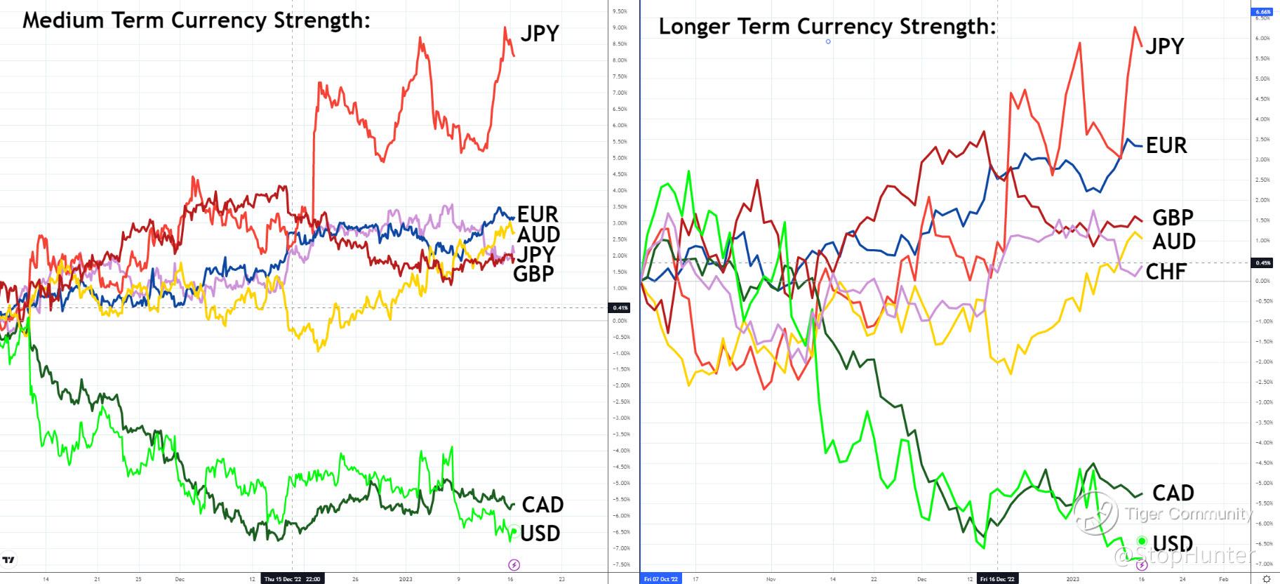 Inflation the headline this week - hopes from UK and Europe that will reduce (see below for reporting calendar). Stock Markets and Crytpo generally stronger over the last week. Gold pushing new highs (see attached chart) as US Dollar stays week (see attached currency strength chart). Chinese GDP and Industrial Production figs out tomorrow. Busier week for US earnings releases - still focus still on financial stocks (see below for more detail)