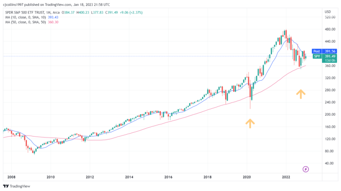 Below is a chart of SPY, but every candle is a month, and the chart goes back a decade. Also added are two simple moving averages; a 10-day and a 50-day.