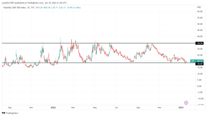 For all of 2022, it has traded in a pattern, almost entirely between the top and bottom black lines of 35 and 18.