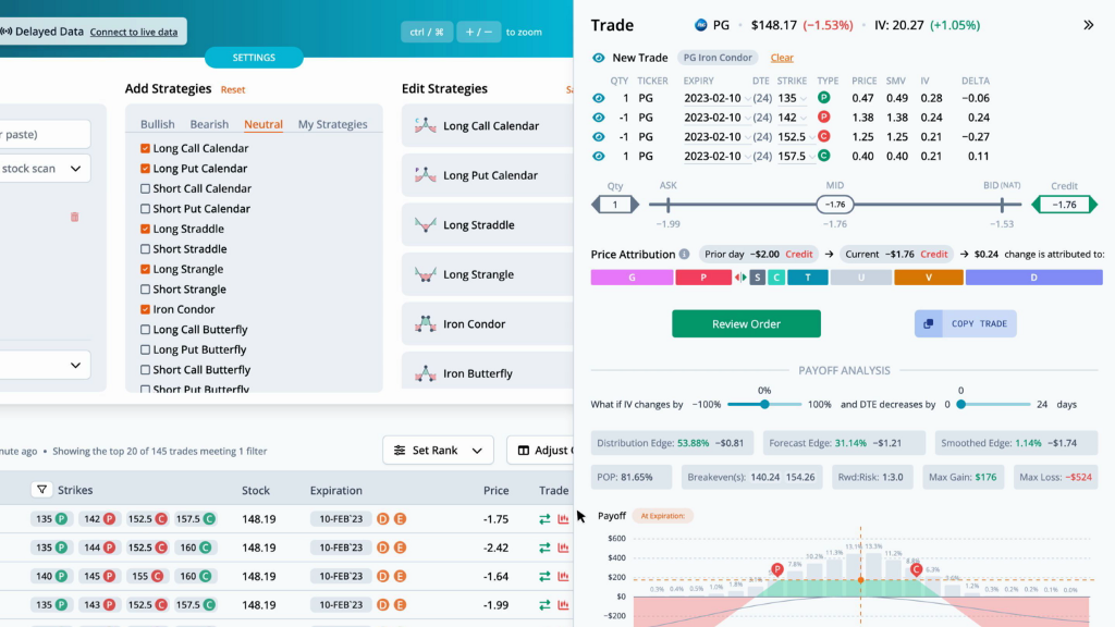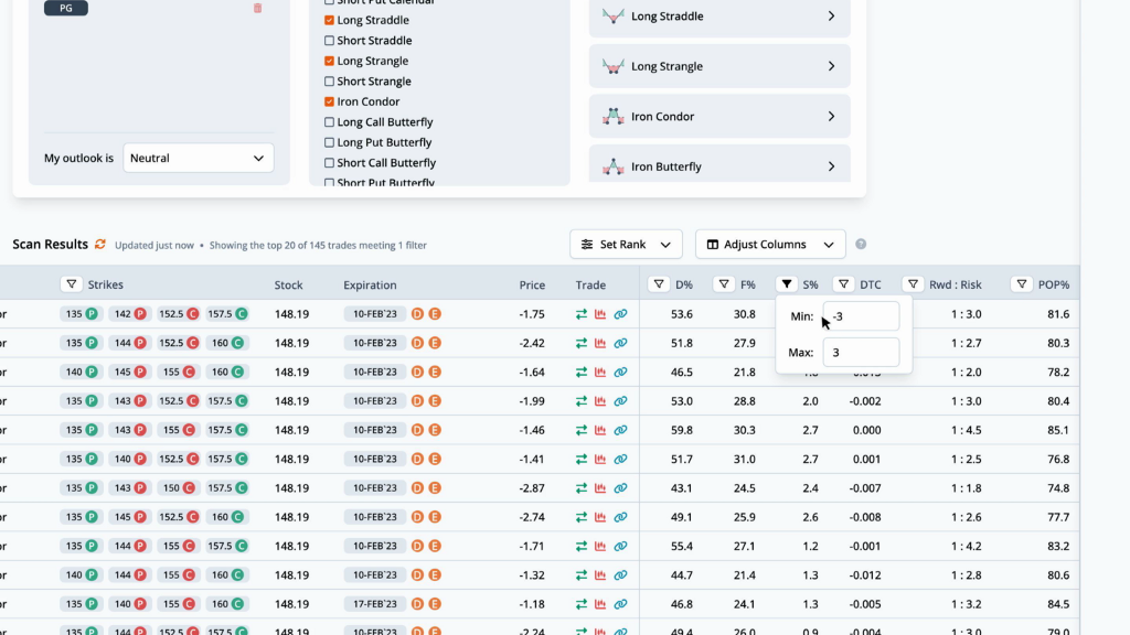 For PG, the current PE ratio is 25.7, which is 5.4% over the average for the last twelve earnings observations. Returning to the overview tab, we can quickly run a scan to find the best option trades. Since earnings are right around the corner, we scan for neutral strategies, then filter the scan results by S%, or smoothed edge, by setting it between negative and positive 3%.