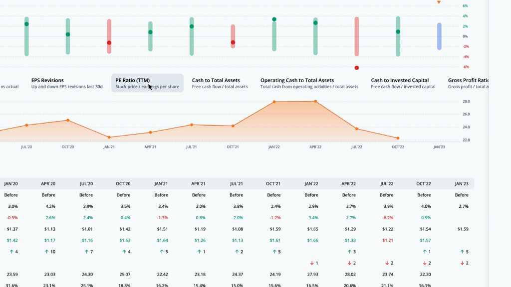 During that time, the post-earnings move was outside of the implied range 2 times. In those cases, long straddles were profitable. The rest of the earnings moves likely yielded profitable short straddles. We can overlay quarterly financial data by clicking on the ratios below the earn move graph. Let’s look at the PE ratio, which is the stock price divided by the trailing twelve months earnings per share.