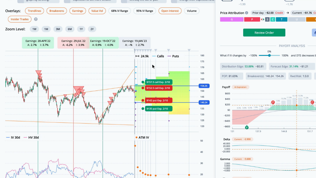 This helps narrow the results to trades that are fairly priced. The highest ranked trade is a IronCondor with strikes at 135, 142, 152.5, and 157.5, expiring on 2023–02–10, for a credit of $1.75.
