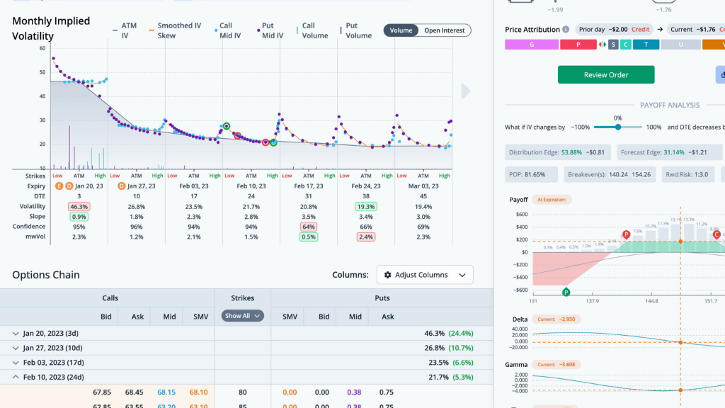 By pulling up the trade, we can see the theoretical values in more detail. The distribution edge, found by the expected value of the payoff picture on the stock’s historical distribution, has an edge of 53.9%. The forecast edge, which is derived from historical volatility, has an edge of 31.1%. Lastly, the smoothed edge, which is calculated by drawing a best fit curve through the monthly implied volatilities, has an edge of 1.1%. The edge is relative to the mid-market price of the trade. Greater positive edges are a theoretical benefit to the trader. We can also look at the payoff graph. The probability of profit sums the probability of the nodes for the part of the payoff picture above the zero profit line over three standard deviations. For this trade the probability of profit is 81.65%. The reward to risk divides the max gain by the max loss. Here the 1 to 3.0 is the ratio of the max gain of $176 to the max loss of $-524. There are two break evens for this IronCondor at 140.24 and 154.26. You can also view the price attribution to see how much each of the individual greeks and theoretical values contribute to the change in trade price from yesterday to today.