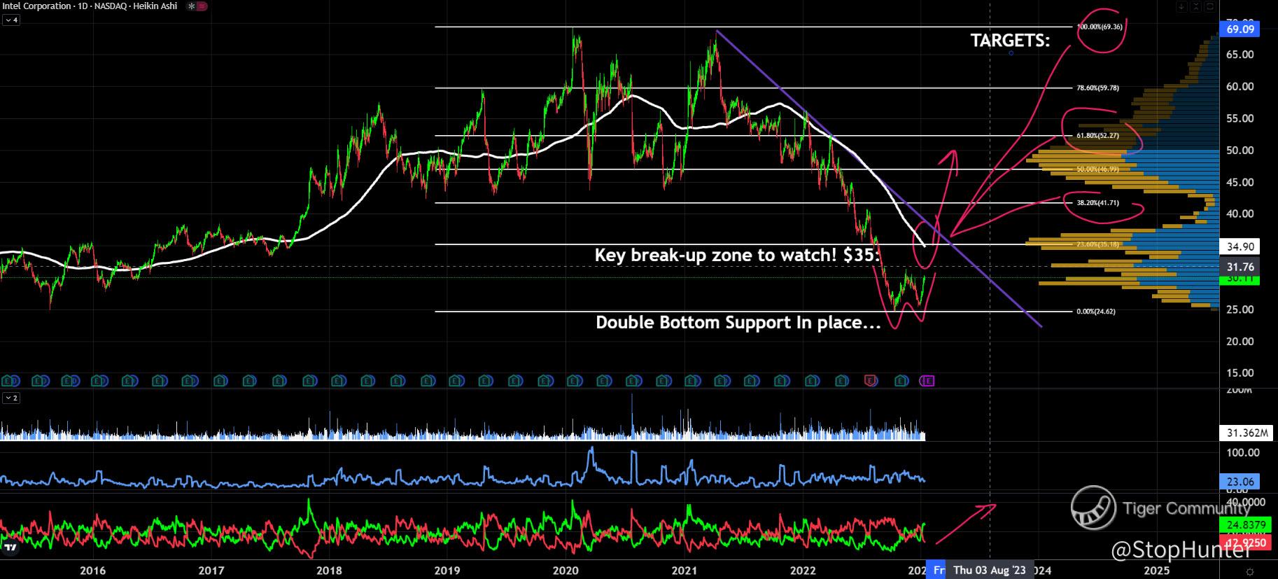 $Intel(INTC)$ - stock to watch! Big into AI, semiconductors - if those 2 sectors can push and recover, Intel are certainly one to watch! Plenty of upside (see attached chart). Targets: 40, 50, 70, Stop Loss 23.