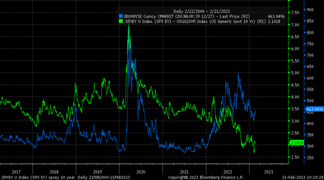 This spread had narrowed mostly because financial conditions had eased. The same relationship had been seen in high-yield credit spreads, which have also contracted, as noted by the CDX high-yield spread, which has also fallen in recent weeks. But now, as rates rise and the dollar strengthens, financial conditions should tighten, and that means spreads should begin to widen again, which should cause the equity risk premiums to widen again. That means the PE ratios of the Nasdaq and the S&P 500 should start to contract.