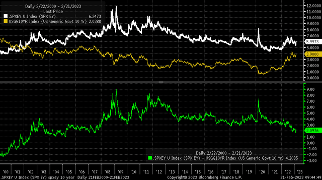 There's also this relationship between the S&P 500 earnings yield and the 10-year nominal rate. The earnings yield for the S&P 500 in 2023 is 5.99%, while the 10-year rate is currently trading around 3.9%. That means the spread between the two is currently 2.1%. That makes the spread between the $S&P 500(.SPX)$ earnings yield and the 10-year nominal rate since 2007.