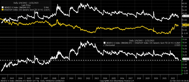 The 2023 $NASDAQ(.IXIC)$ PE ratio is 23.9, which means the Nasdaq 100 earnings yield is 4.2%, and with the 10-Year real yield now at 1.5%, the spread betweenthe two is 2.7%, that is the lowest equity risk premium between the $NASDAQ(.IXIC)$ earnings yield and the 10-year real yield since at least 2010.
