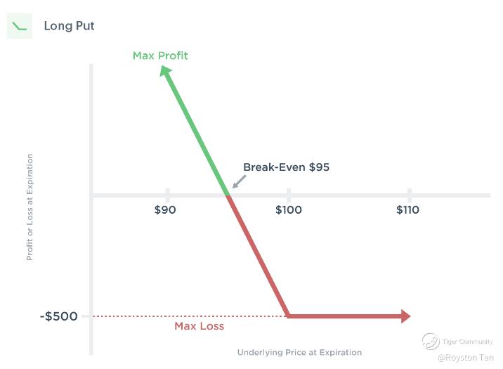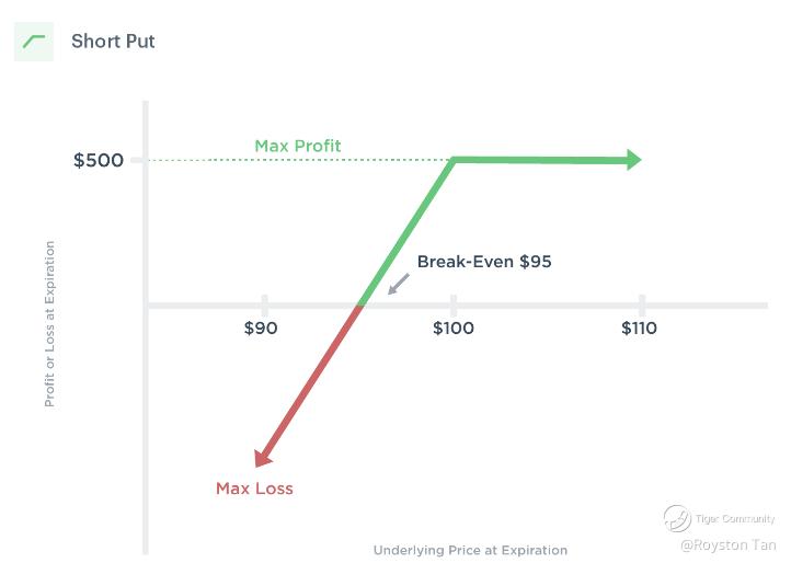Your profit potential, on the other hand, starts increasing as the share price of the underlying gets lower, with the maximum profit potential reached when the share price hits $0.