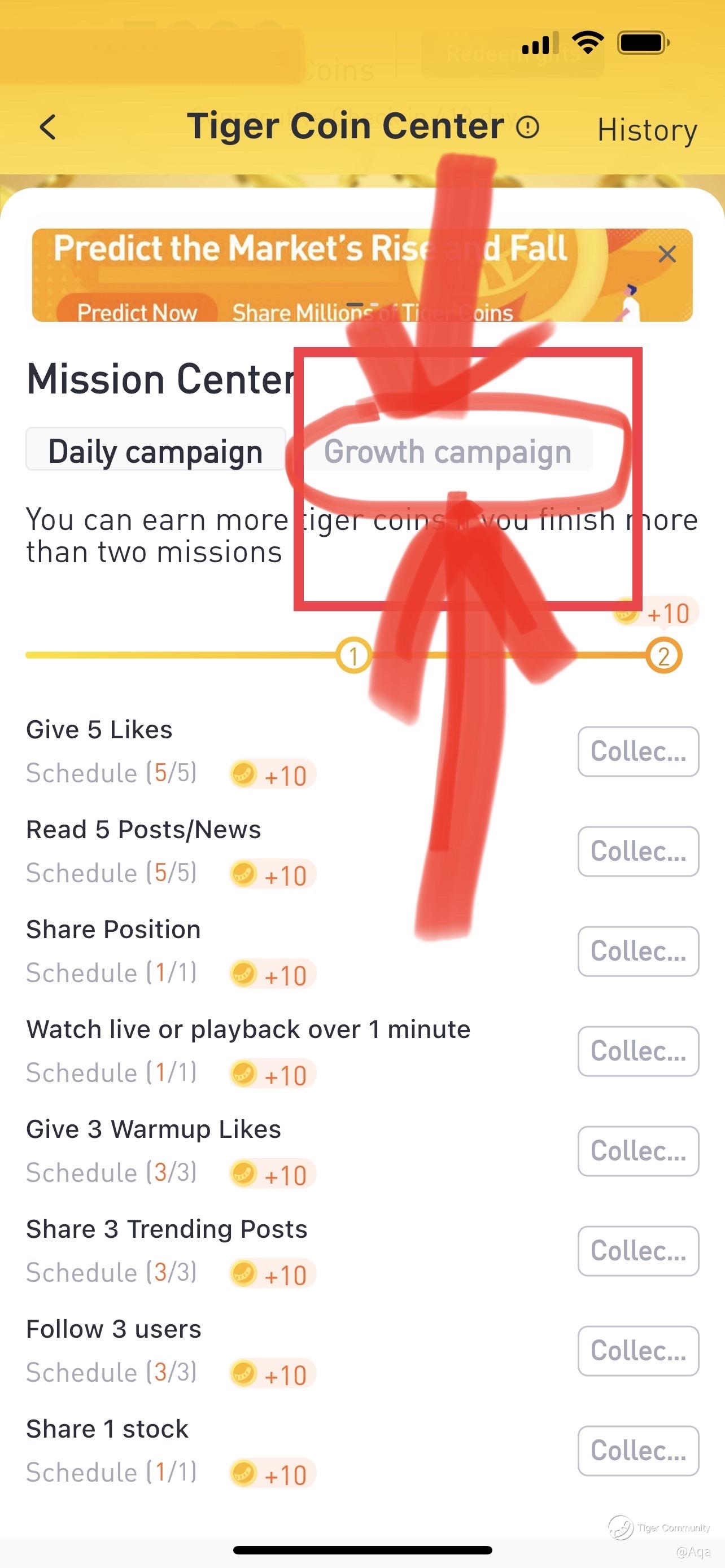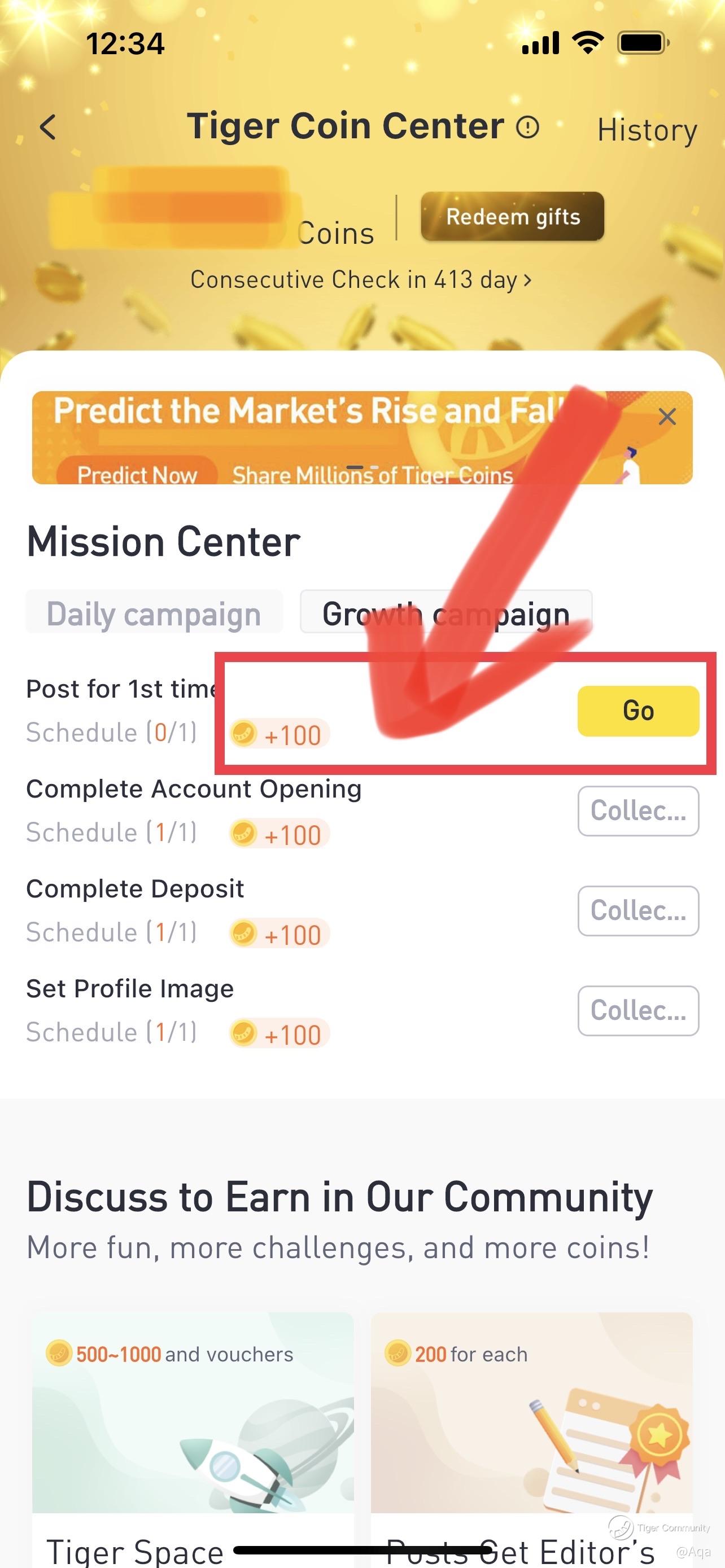 Remember to tap the "Growth campaign" and then tap on the "Post for 1st time" to be rewarded with the sure-win 100 Tiger coins! See the pictures I attached below for step-by-step approach.