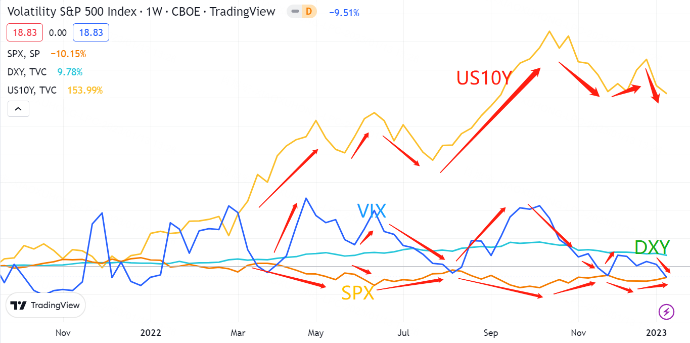 From the perspective of sentiment and the macro environment, the trends of US10Y, VIX, and DXY may also provide some comprehensive guidance for the next short-term trend of $S&P 500(.SPX)$ . Please refer to the comparison in the chart below from Tradingview.