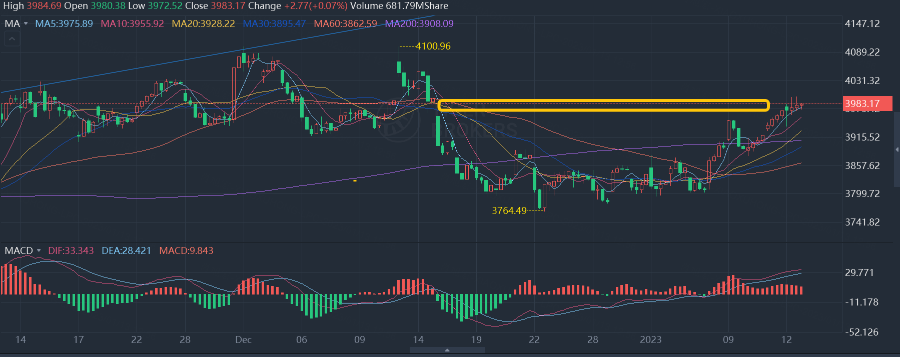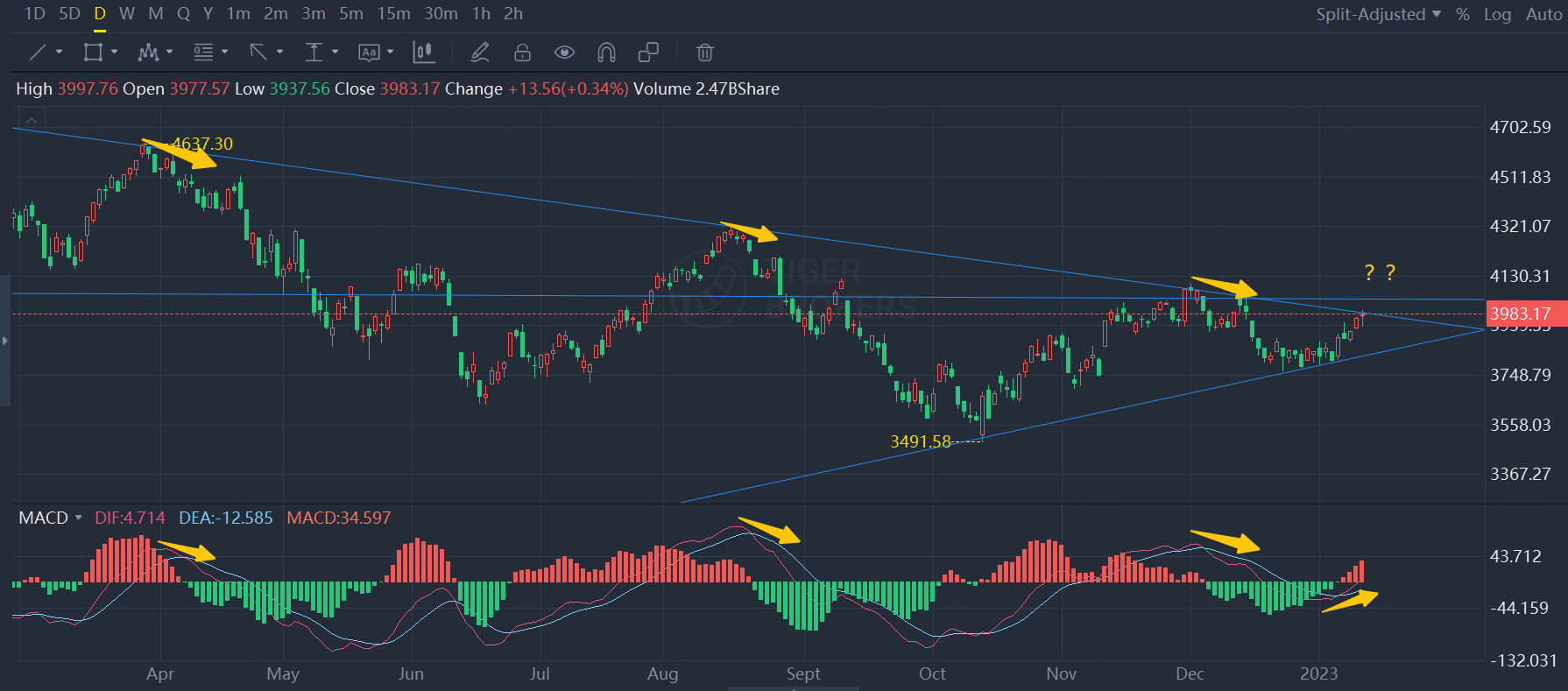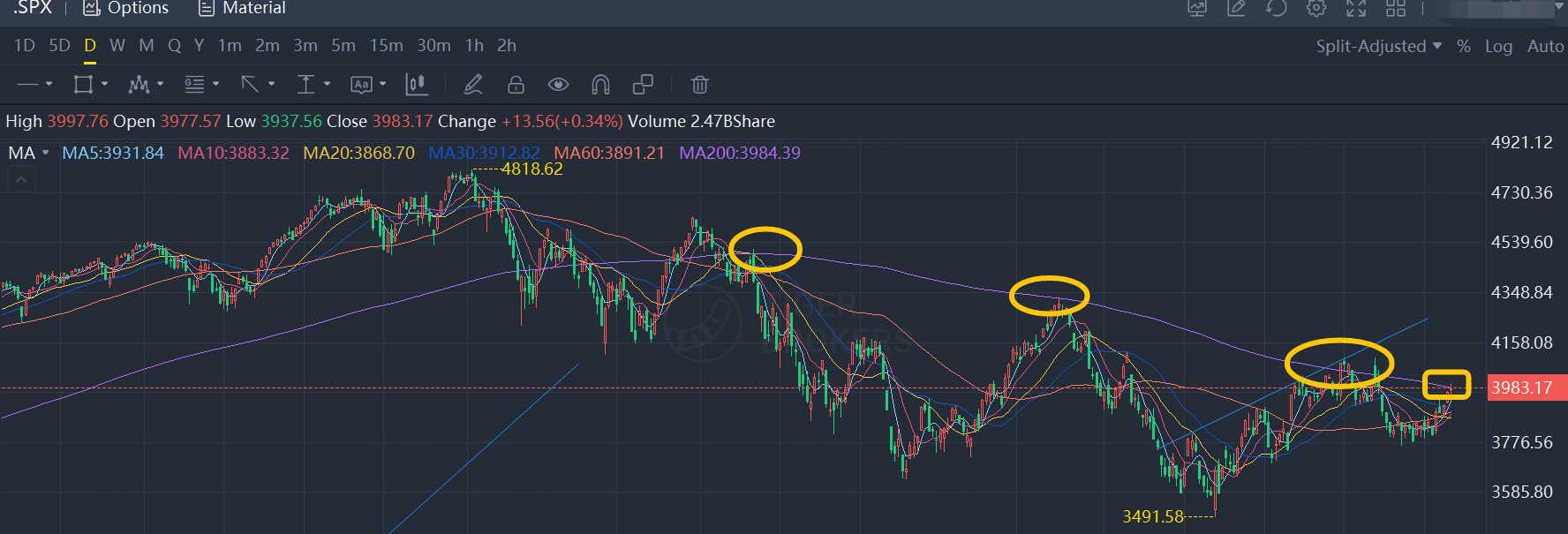 From the perspective of technical analysis, $S&P 500(.SPX)$ also come to a key area -- the 200DMA(point at 3,984) again. Previously, $S&P 500(.SPX)$ hit the 200DMA in March, April, August, and November of 2022 for 4 times, especially the previous 3 times all turned fail finally.