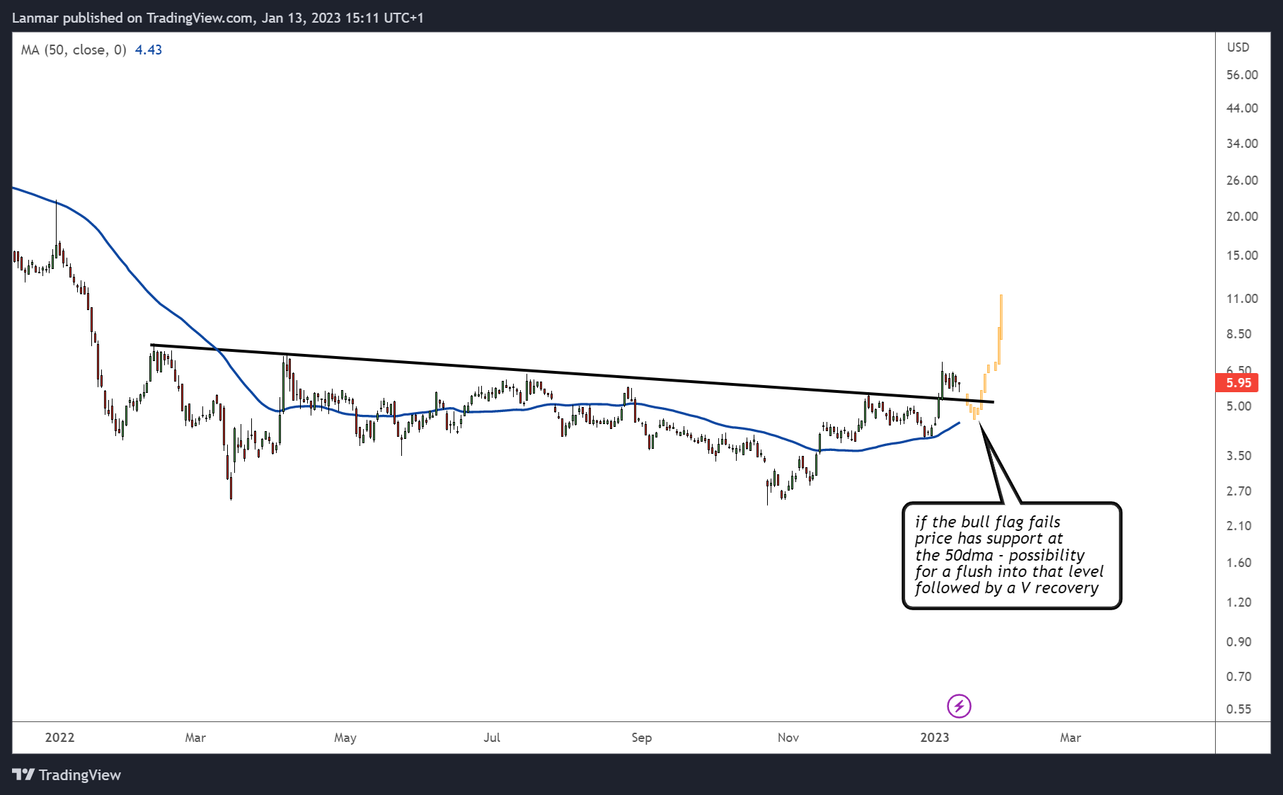 If entering early in anticipation of the break of 6.42, the stop could either be tight (below the breakout line) or wide below the 50dma (under 4.50) as a fake-out is in the cards prior to a bigger move: