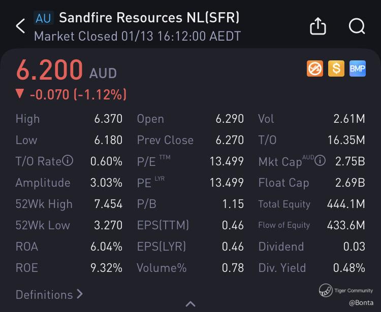 $Sandfire Resources NL(SFR.AU)$ is currently priced at $6.2 P/B 1.15.