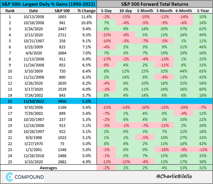 1.The S&P 500$S&P 500(.SPX)$ gained 5.5% today, its largest % increase since April 2020 and 15th largest since 1950. One year later the market has often been higher following these large daily spikes (22 out of 24 times) with an average return of +31%. The 2 exceptions: Sep 2008 & Jan 2001. The only US index that looks very bullish is Dow, but then again Dow is price-weighted with 30 stocks. SPX is what really matters and it is still a downtrend. It should break 4100 first then we can talk! Good day though :)