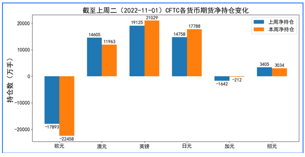 According to the 2022-11-01 Futures Market Position Report released by the US Commodity Futures Commission, Last week, the reported total positions of various currencies were as follows: euro net short changed by 4,565 lots, Australian dollar net short changed by 2,642 lots, British pound net long changed by 1,904 lots, Japanese yen net long changed by 3,030 lots, Canadian dollar net long changed by 1,430 lots, and New Zealand dollar net short changed by 371 lots. Last week, there was no currency with long-short conversion of total positions. In addition, the currencies whose one-way total positions have changed by more than 20% are: Euro and Japanese Yen.
