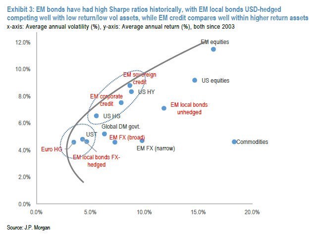 Historical data shows that EM debt has a higher Sharpe Ratio as compared to similar debt in the DM (Developed Market). The comparable yields in the DMs can be discovered in the below-investment-grade corporate debt such as HY (High Yield) / Junk bonds. For those who are not aware of the term Sharp Ratio: