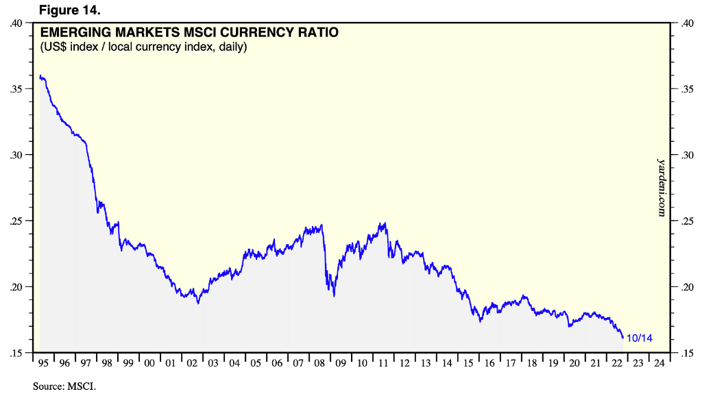 The EM MSCI Currency ratio has been falling since 2010 and has reached an all-time low, depicting extreme local currency weakness across the board.
