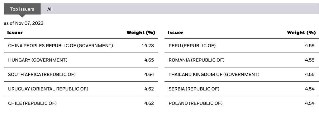 Well, the USD Denominated EM Debt still had positive pre-tax returns, the iShares J.P. Morgan EM Local Currency Bond ETF, which tracks the index comprised of local currency-denominated EM sovereign debt, has been a disaster. So let us first look at the composition of the ETF.