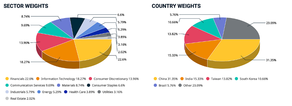 Financials dominate the MSCI EM index, while IT and Consumer Discretionary are the second and third largest holdings. When we look at the country-wise exposure, we find that Chinese equities constitute the bulk of the exposure, while India and Taiwan have the second and third largest weightage.