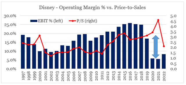 On a positive note, the massive decline in Disney's share price has now brought the company's price-to-sales multiple more in line with its operating profitability.