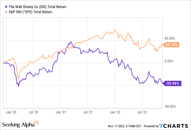 However, the 39% decline in DIS share price was more than twice that of the broader market. This results in a significant underperformance of Disney on a risk-adjusted basis, given the media company 5-yearbeta of 1.25.