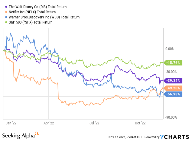 So far 2022 has been a rough year for equities overall, although growth stocks suffered far more when compared to value. The good news was that Disney fared slightly better than its peers - Netflix (NFLX) and Warner Bros Discovery (WBD) since the beginning of the year.