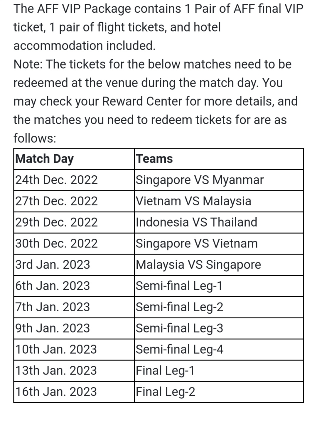 For the AFF VIP Package, it includes a pair of match tickets, a pair of flight tickets and hotelstay: