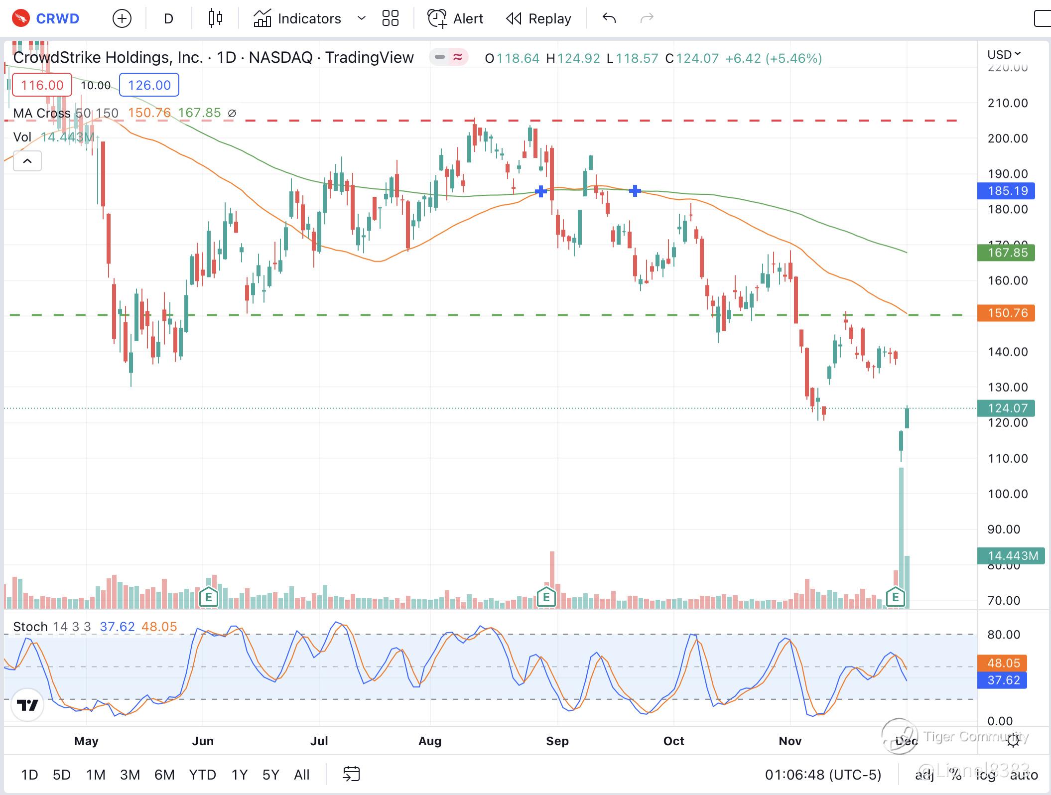 Today's stock to watch would be CrowdStrike Holdings ( $CrowdStrike Holdings, Inc.(CRWD)$ ). After CrowdStrike reported earnings that were below analysts estimates and weak guidance for the following quarter, the stock gapped down lower but has since parred those losses to close 14.7% lower and formed a bullish green ice cream bar.