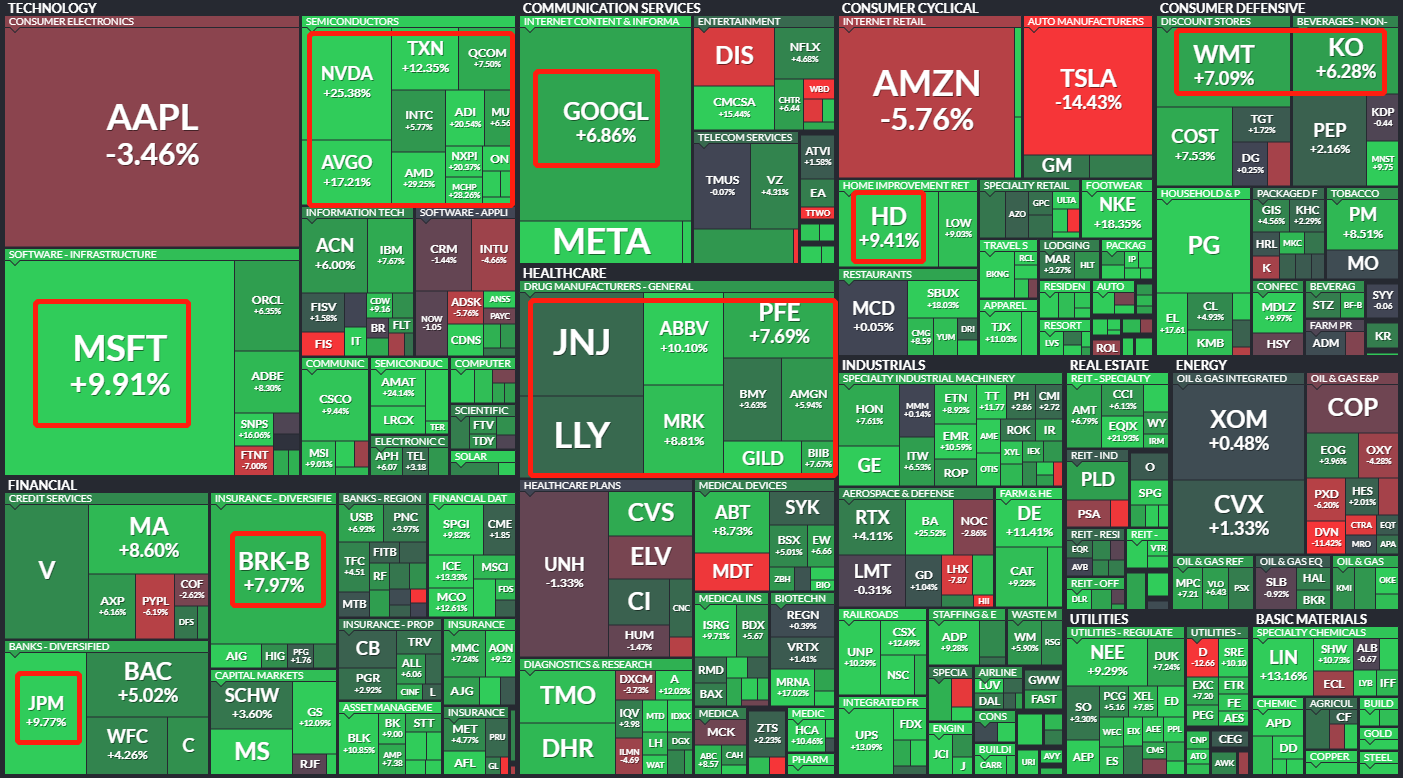Among the large-cap stocks: $Microsoft (MSFT) $rose 9. 91%, $Berkshire Hathaway (BRK. B) rose 7. 97%, $Wal Mart (WMT) $ up 7. 09%.