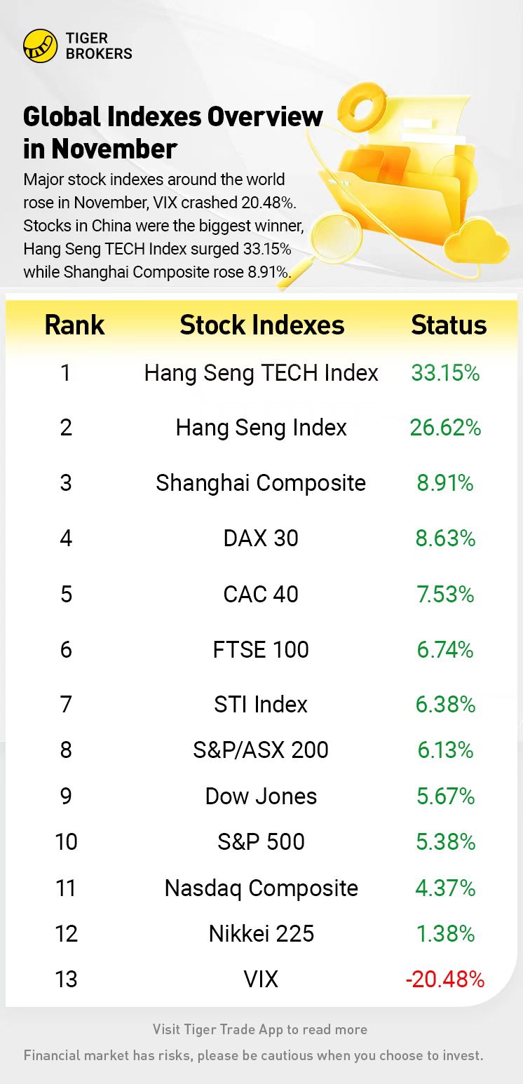 As of November 30, the US stock market major index $S&P 500(.SPX)$ rise 5.38% in November, $NASDAQ(.IXIC)$ rose 4.37% and $DJIA(.DJI)$ rose 5.67% in November respectively.