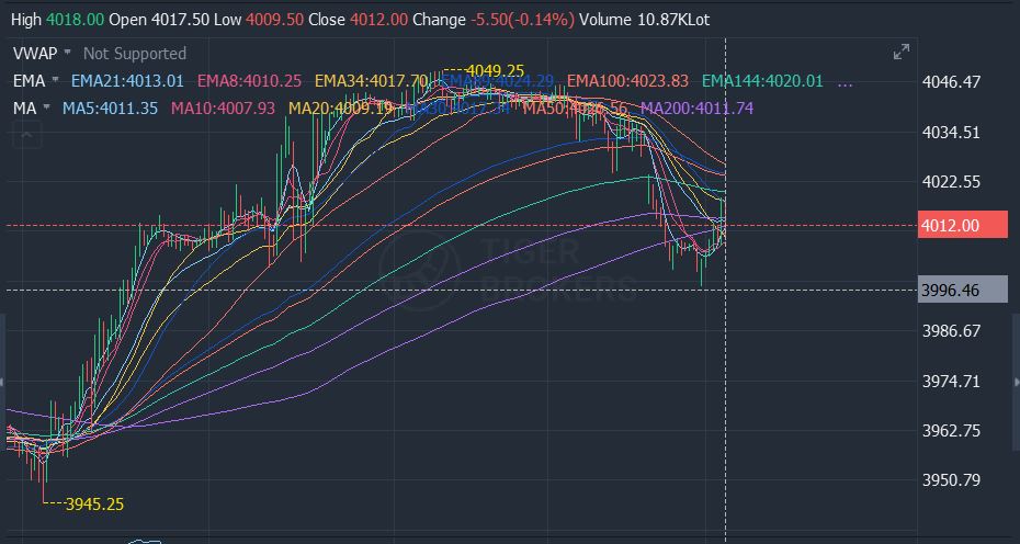 I see a top at 4,050 or so and a right shoulder forming that is currently holding above the 4,000 level. If we can't hold above this level or break above and fill the gap at 4,030s then I think there will be a huge retracement back down to the 3,940 area. This will tie in with the cycle lows that are coming in and the failure to break above the 200SMA.