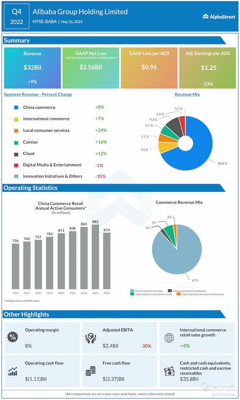 Alibaba's China commerce segment fell 1% to $21.19 billion. Alibaba's cloud segment did revenue of $1.59 billion, up 10% year over year.