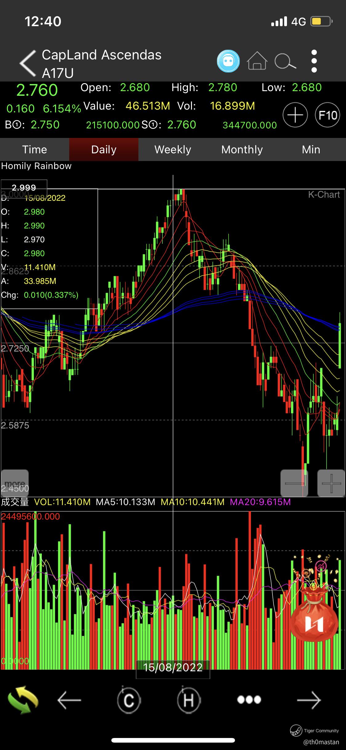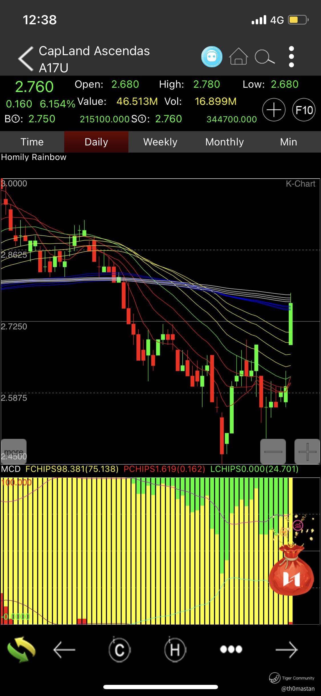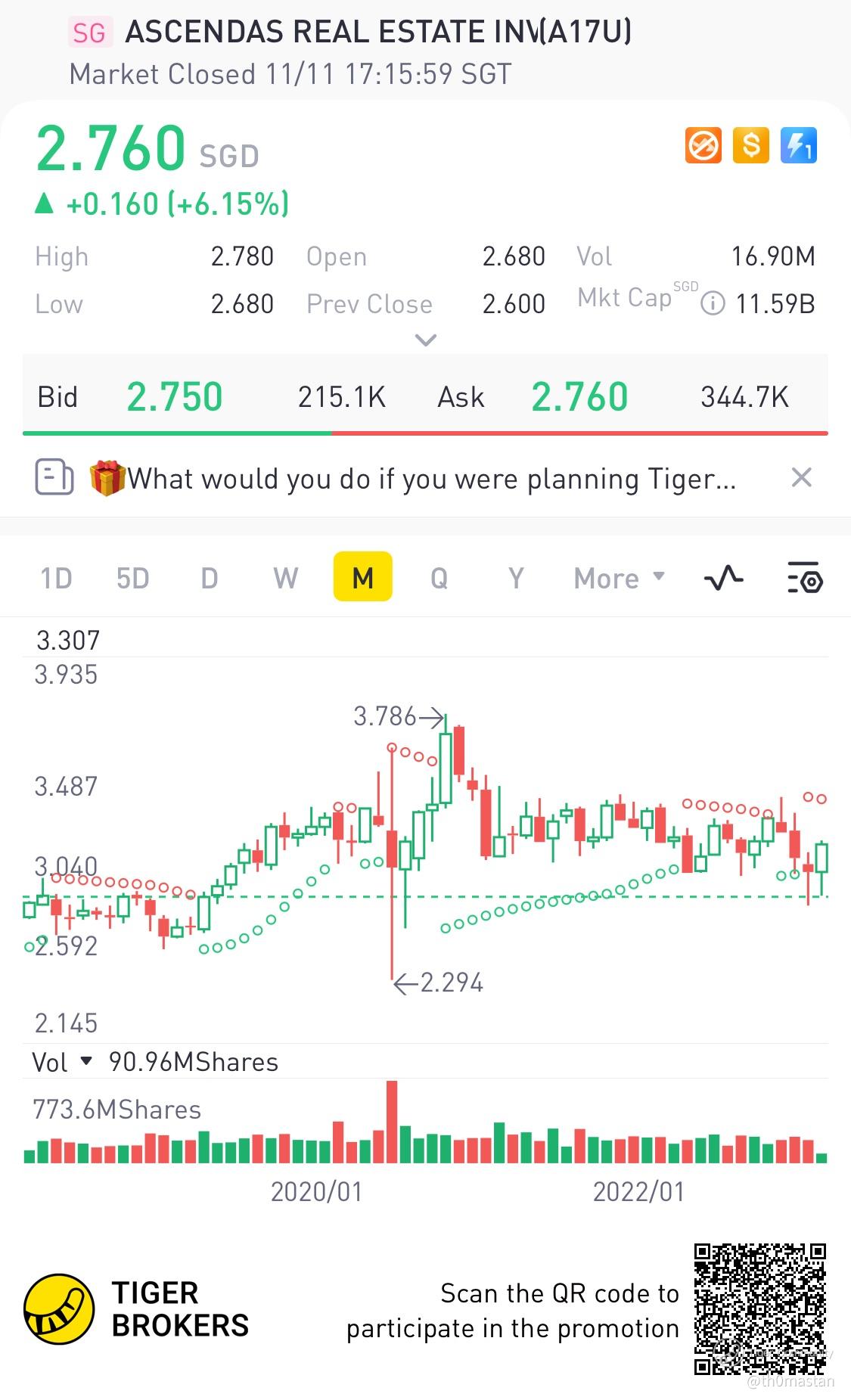 $ASCENDAS REAL ESTATE INV TRUST(A17U.SI)$ The share price is a brink of a breakout. It has met with some slight resistance at 2.8 as seen by the white trend lines.