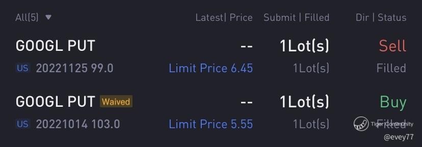 Believe in $Alphabet(GOOGL)$but given the current downtrend, have rolled down my put option from the strike px of $103 to $99 for an additional small credit. If the px falls further, I may buy direct from the market and continue to roll this option until it turns profitable 😬