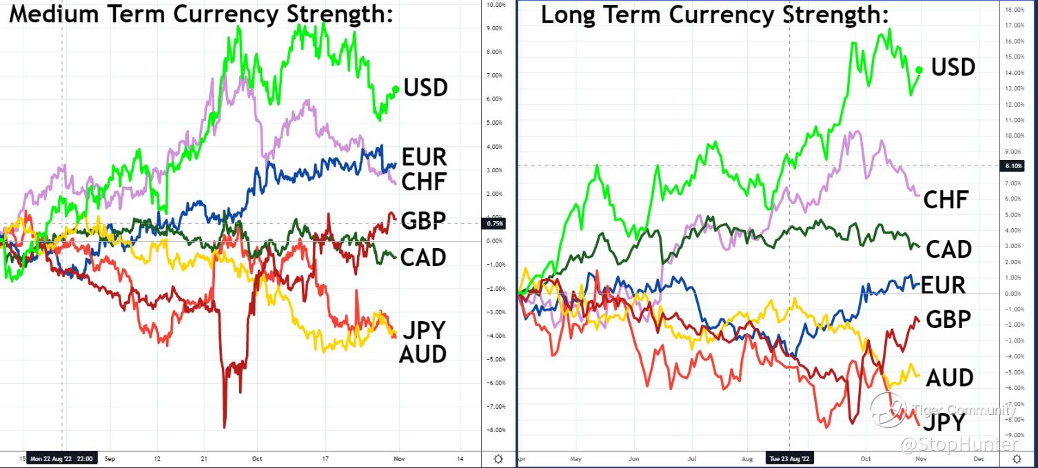 Forex: USD still king of the roost! GBP holding recovery. EUR strengthening. AUD, JPY weak and CHF giving back strength gains. Pair combo ideas: +USDJPY, -AUDUSD, +GBPUSD, +GBPJPY, +USDCHF (see currency strength chart attached)