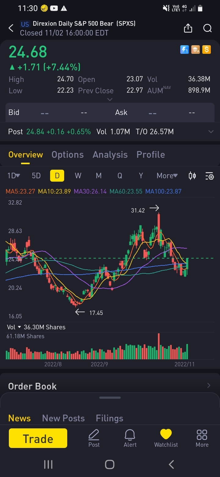 4. If Prediction or the flow is correct, SPXS will climb up and test $26 (MA60) again soon or break $26