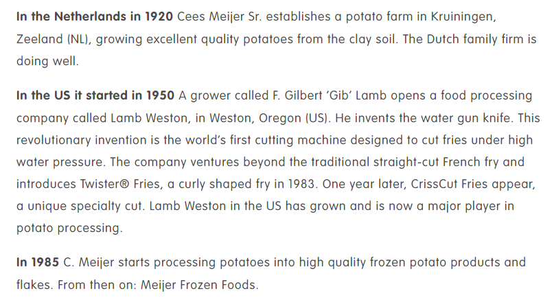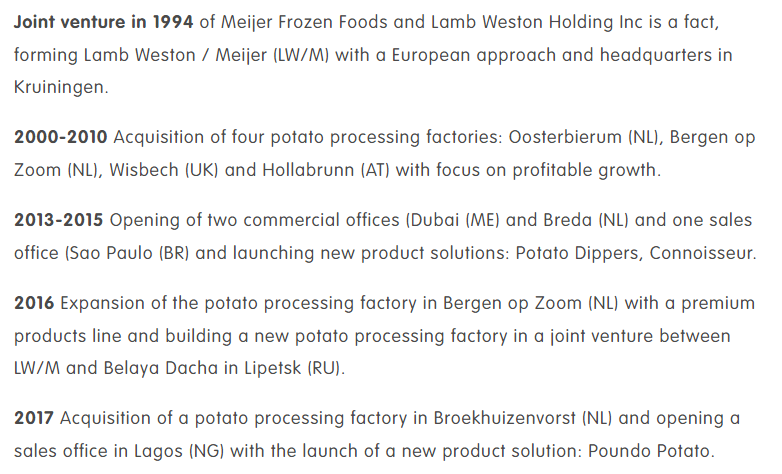 2022: Lamb Weston Holdings, Inc. has entered an agreement to purchase the remaining equity in its European joint venture with Meijier Frozen Foods BV for more than $680 million.