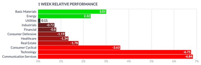 The three best-performing sectors over the past week were Basic Materials, Energy, and Utilities, with all other industries showing a decline.